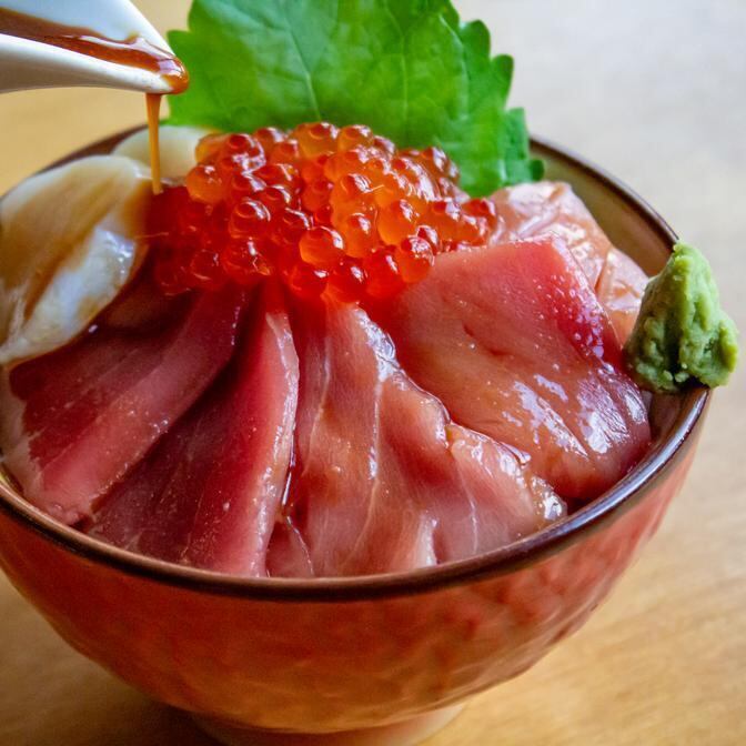 原材料名:本マグロ(長崎県産)、ホタテ(北海道産)、味付けいくら(カラフトマスの卵(アメリカ合衆国産)水飴、醤油、米発酵調味料、食塩/調味料(有機酸等)、(一部に小麦・いくら・大豆を含む))